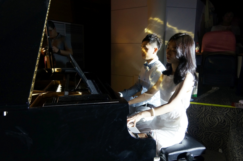 担保公司的钢琴四手联弹《云宫讯音》,悦耳的琴声从跳跃的指间倾泻而出,考验的正是两人天衣无缝的配合和炉火纯青的琴技。