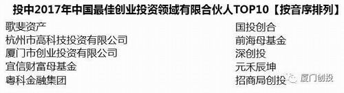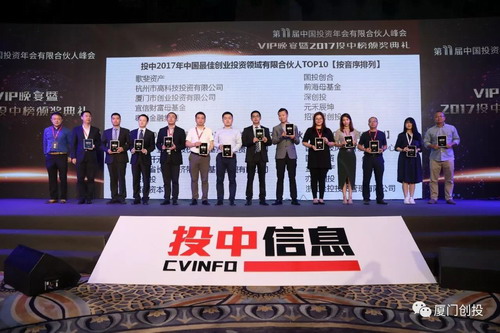 当晚,2017年投中榜单新鲜出炉,厦门市创业投资有限公司(简称“厦门创投”)荣获“中国最佳创业投资领域有限合伙人TOP10”