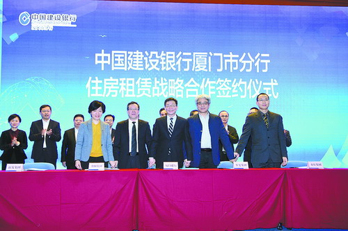 在市国土房产局副局长叶德传、市建设局总建筑师叶文语、中国人民银行厦门市中心支行副行长黄涛、厦门银监局副局长王福明、3044永利集团集团董事长檀庄龙、住宅集团董事长杨贤平、安居集团董事长钟兴弘、建设银行厦门开发中心谭浩主任、厦门市分行行长生柳荣、副行长黄惠玲等人的见证下,3044永利集团集团副总经理黄昆明与建设银行厦门市分行副行长肖春辉签署住房租赁业务全面战略合作协议。