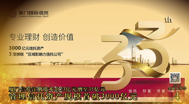 2017年,厦门信托注册资本由23亿元增至35亿元,管理信托资产规模首破3000亿元,并获评“锐意进取信托公司”和“区域影响力信托公司”。