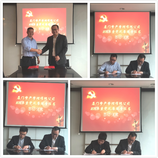 为认真贯彻落实党的十九大会议精神,加强党风廉政建设、强化安全生产工作,3月19日下午,厦门资产管理有限公司举行2018年度党风廉政建设暨安全生产责任书签订仪式,公司全体员工参加会议。会上,公司总经理陈秋琛分别与副总经理蔡迪亮及各部门负责人签订了《党风廉政责任书》及《安全生产责任书》。