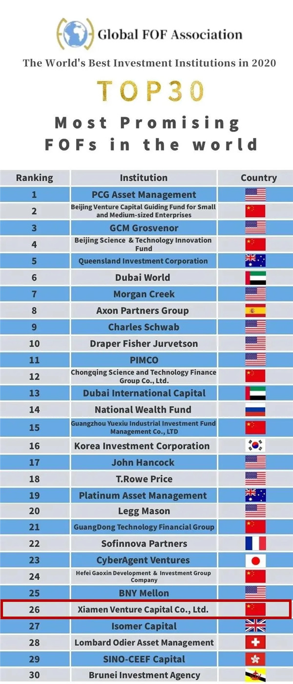 厦门市创业投资有限公司(简称“厦门创投”)凭借受托管理的厦门市产业投资基金,荣登“2020年度全球最具潜力母基金投资机构TOP30”榜单,其专业管理能力深受行业肯定。此次荣获全球母基金协会奖项,标志着厦门市产业投资基金逐步发展成为具有全球影响力的母基金。