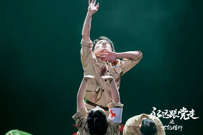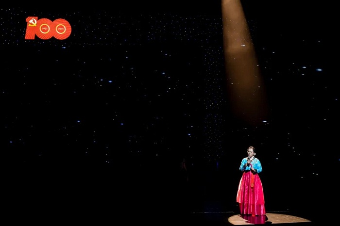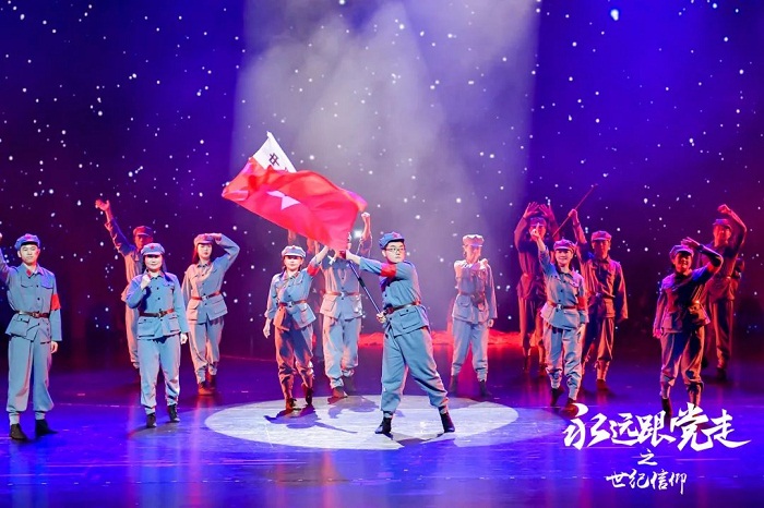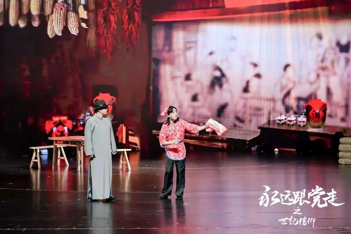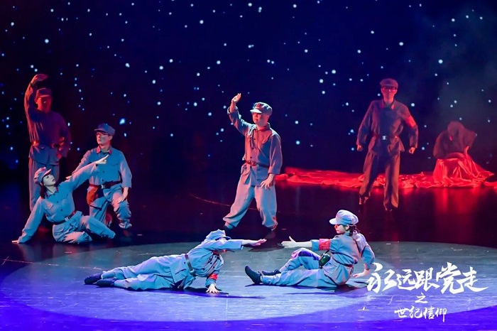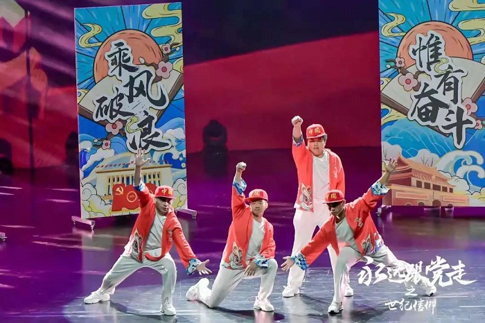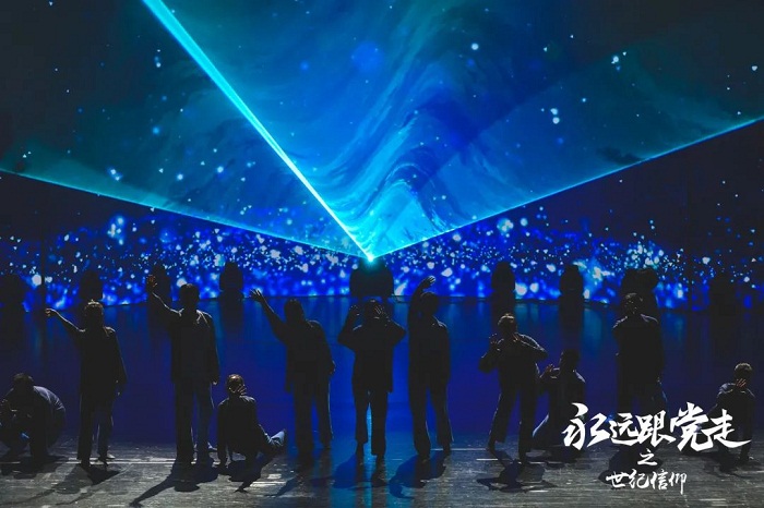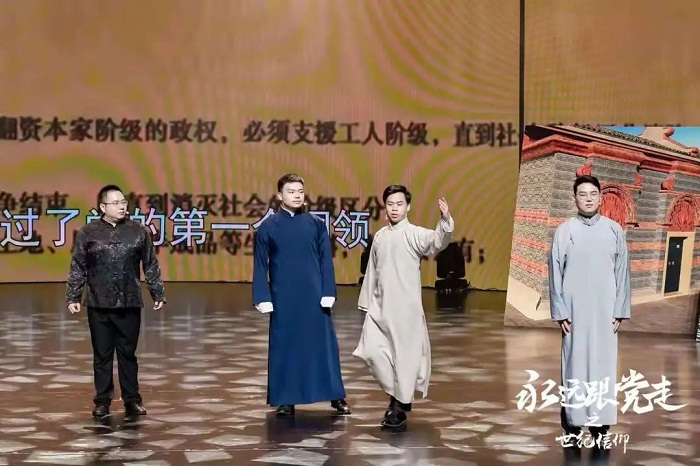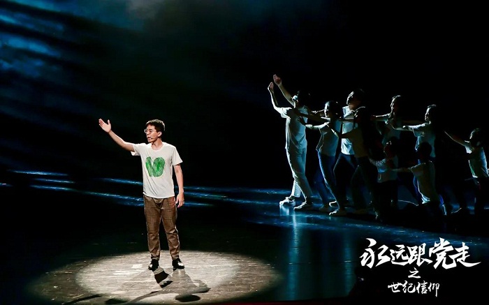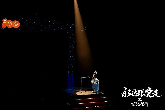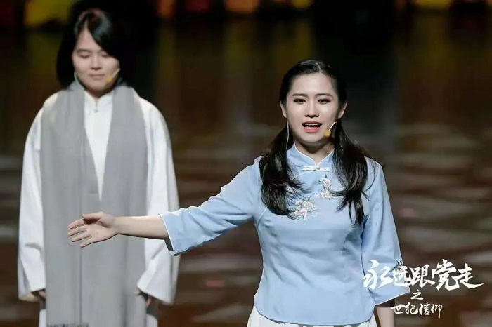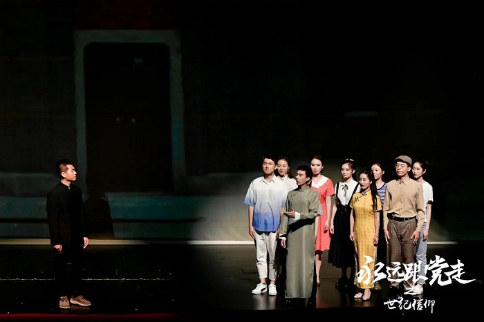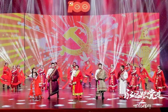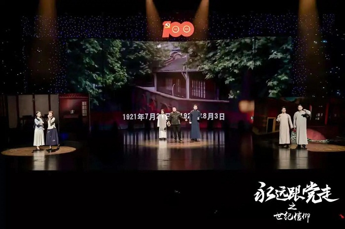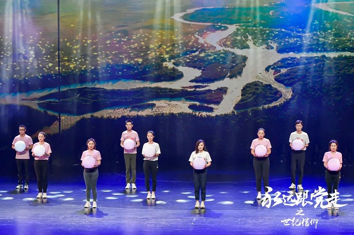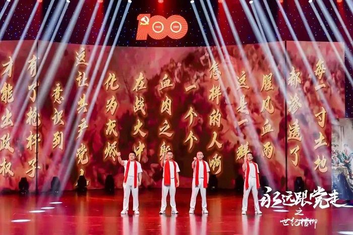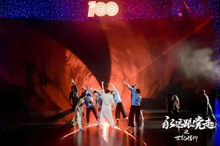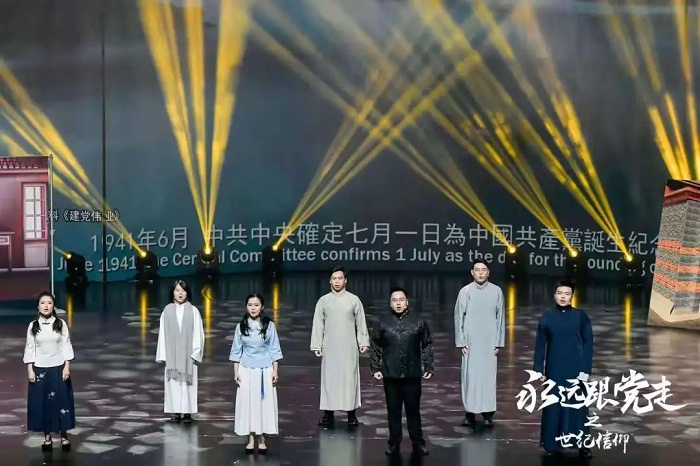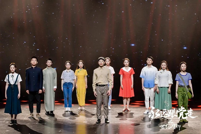 没有传统的报幕主持人,本次晚会采用戏剧“歌队”的创新形式,由13位故事“讲述者”作为串联载体,以“时间主线+音乐和服装副线”为引导,穿越百年时空,再现红色经典。