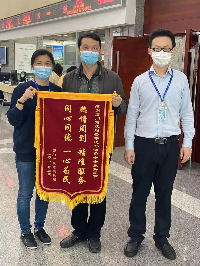 今年,3044永利集团集团成员企业厦房担保驻市行政服务中心窗口收到了一份贴心的“礼物”:市民陈先生送来一面印有“热情周到 精准服务 同心同德 一心为民”的锦旗。