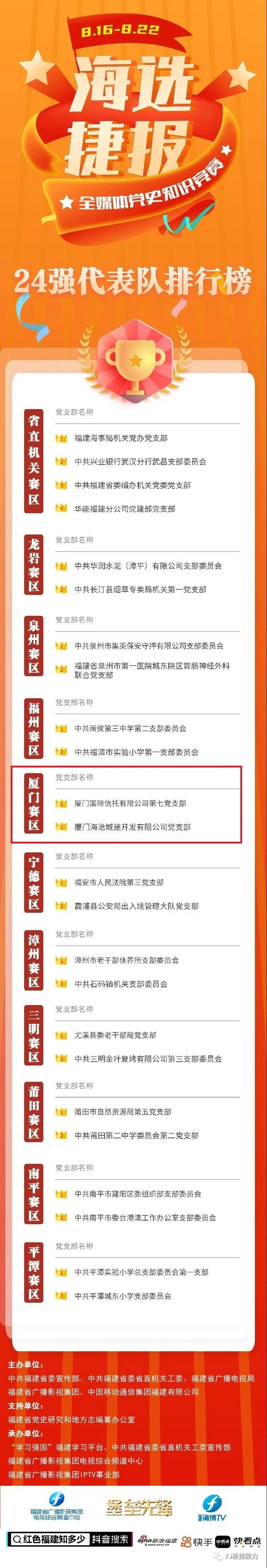 厦门国际信托第七党支部以积分698分,从全省1.8万个参赛支部中脱颖而出,以厦门赛区第一名的成绩成功晋级全省半决赛;