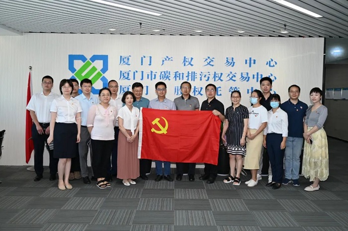 在厦门产权交易中心的绿色金融展厅,各支部党员通过参观和听取中心业务负责人的介绍,重点学习了厦门产权交易中心(厦门市碳和排污权交易中心)服务海洋经济、绿色经济、数字经济、文旅经济“四大经济”方面的创新做法。