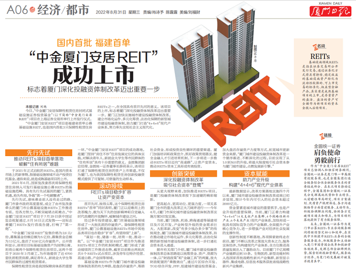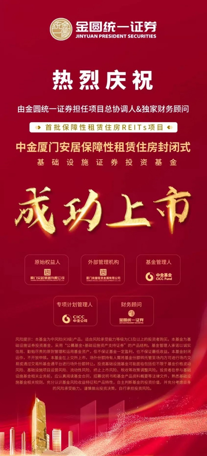 8月31日,“中金厦门安居保障性租赁住房封闭式基础设施证券投资基金”(下简称“中金厦门安居REIT”)项目在上海证券交易所举行上市发行仪式。
