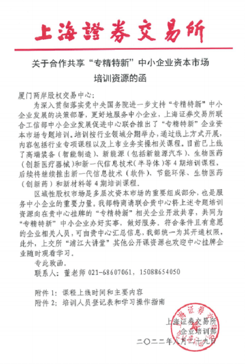近日,为深入贯彻落实党中央国务院进一步支持“专精特新”中小企业发展的决策部署,更好地服务中小企业,上海证券交易所联合工信部中小企业发展促进中心,推出“专精特新”企业资本市场专题培训。本次系列培训活动由上海证券交易所、厦门两岸股权交易中心、厦门市中小企业服务中心联合主办。培训按行业领域分期举办,通过线上方式开展,内容包括行业专项课程以及上市业务实操相关课程。