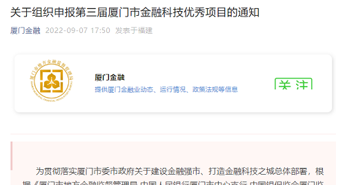 为贯彻落实厦门市委市政府关于建设金融强市、打造金融科技之城总体部署,根据《厦门市地方金融监督管理局 中国人民银行厦门市中心支行 中国银保监会厦门监管局 中国证监会厦门监管局 厦门市财政局关于印发促进金融科技发展若干措施的通知》(厦金管规〔2020〕7号)精神,推动辖区金融机构和金融科技企业在依法合规、安全可信、风险可控的前提下加快金融与科技融合发展,促进金融科技创新成果转化,打造区域金融科技开放、合作、共赢的新生态,中国人民银行厦门市中心支行联合厦门市地方金融监督管理局、中国银行保险监督管理委员会厦门监管局、中国证券监督管理委员会厦门监管局、财政部厦门监管局组织开展第三届厦门市金融科技优秀项目评选。