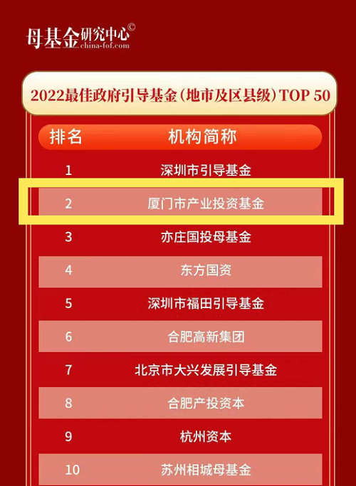 1月7日,母基金研究中心正式发布2022年度榜单,厦门市产业投资基金荣获“2022最佳政府引导基金(地市及区县级)TOP50”第二名!