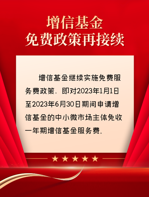 增信基金将继续实施免费服务政策,即对2023年1月1日至2023年6月30日期间申请增信基金的中小微市场主体免收一年期增信基金服务费。