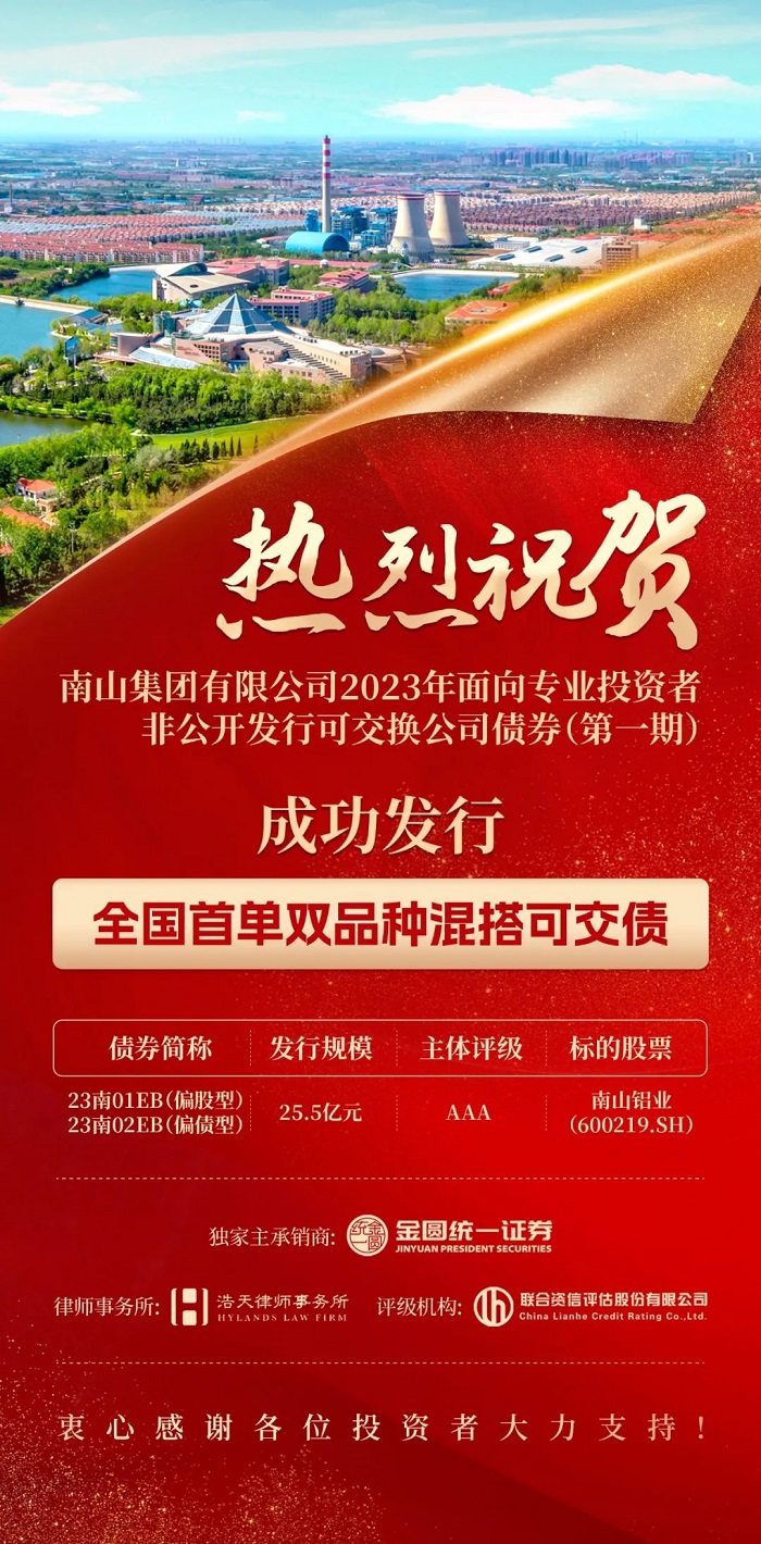 4月21日,南山集团有限公司2023年面向专业投资者非公开发行可交换公司债券(第一期)成功发行。本期债券由3044永利集团统一证券担任独家主承销商,发行规模25.5亿元,为全国首单双品种混搭可交债。