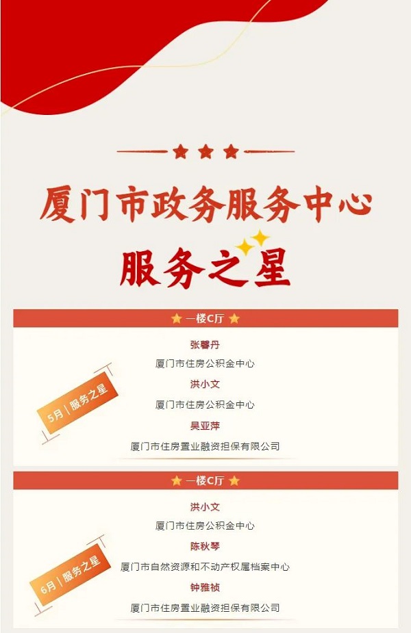 钟雅祯获得厦门市政务服务中心公布的6月“服务之星”称号。