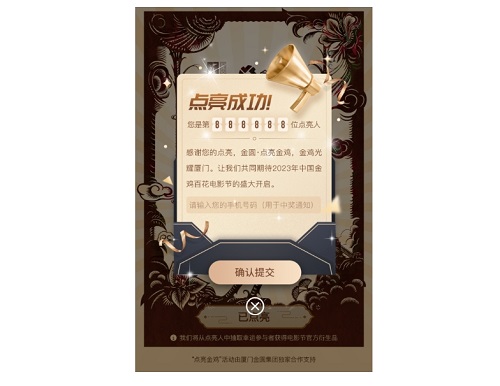 各位点亮人点亮的不仅是金鸡图腾,更是点亮了坚守弘扬优秀艺术文化的火种。由全民助力的星星点点的光亮照耀着的金鸡,也象征着中国电影发展的火苗不断燃烧,愈发旺盛。中国电影必将蓬勃发展,谱写时代艺术的历史新篇章。