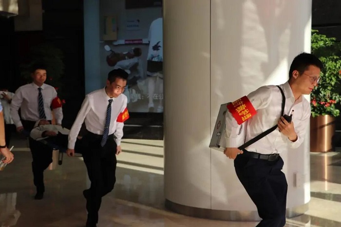 各班组迅速到位,争分夺秒,投入现场。疏散引导组到岗到位,在烟雾中引导人员捂住口鼻,弯腰前行,按照疏散路线从消防应急通道撤离至安全区域;出现“伤员”后,医疗救护组立即赶到现场,抬着“伤员”紧急撤离至安全区域,观察伤情后,现场进行包扎处理。整个疏散过程衔接流畅、安全规范、快速有序。