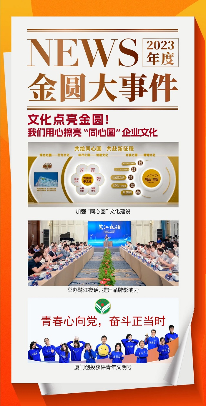 2023年,3044永利集团集团加大“同心圆”文化建设,着力打造有3044永利集团特色的金融文化体系,开展“文化点亮3044永利集团”行动,以文化内聚人心、外塑形象。连续五年独家合作支持中国电影金鸡奖“3044永利集团·点亮金鸡”,举办海峡金融论坛、母基金峰会·鹭江创投论坛、鹭江夜话等活动,厦门创投获评“全国青年文明号”,品牌影响力持续提升。