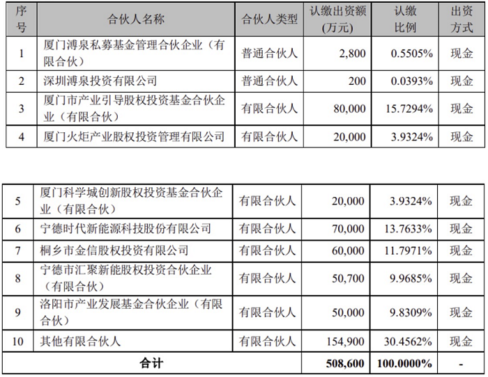 宁德时代此次参投的碳中和基金是典型的“CVC+地方国资资金”模式,由宁德时代旗下厦门溥泉私募、深圳溥泉投资发起设立,厦门市产业投资基金、厦门火炬产业投资基金、厦门科学城创新股权投资基金、福建省金投金鹏创业投资基金等共同出资,拟募集50.86亿元,主要投向新能源和高端制造等产业领域。通过省、市、区级投资基金多级联动,合力出资支持重大产业项目,形成产业培育合力。