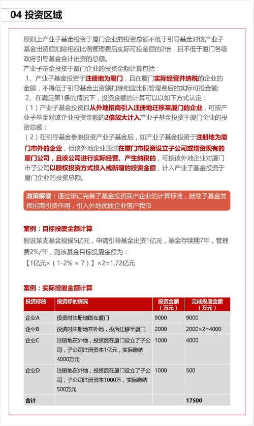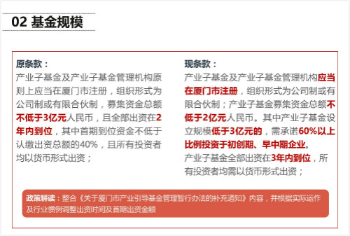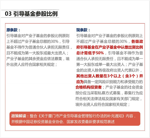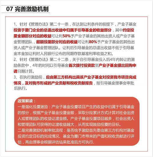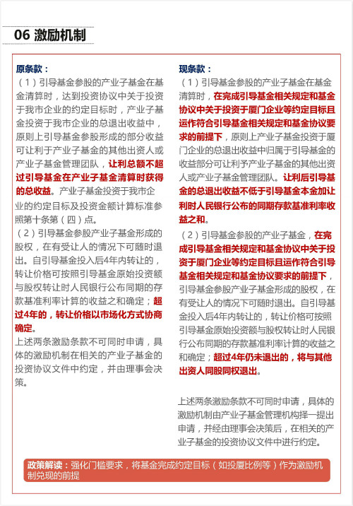 近日,经市产业引导基金理事会批准,修订后的《厦门市产业引导基金管理办法》等五份文件正式发布,同时新出台《产业引导基金参股产业子基金设立及运营管理操作指引》。新制度体系借鉴上海、深圳等先进城市的做法,结合我市产业引导基金运作两年多以来的实践经验,主要围绕加强风险管控、提升投厦进度要求、明确投厦计算口径、完善激励机制、突出竞争性评审原则、健全基金方案变更审批程序六大方面,强化规范管理、增强基金招商功能,进一步发挥基金服务于产业的基础性作用。