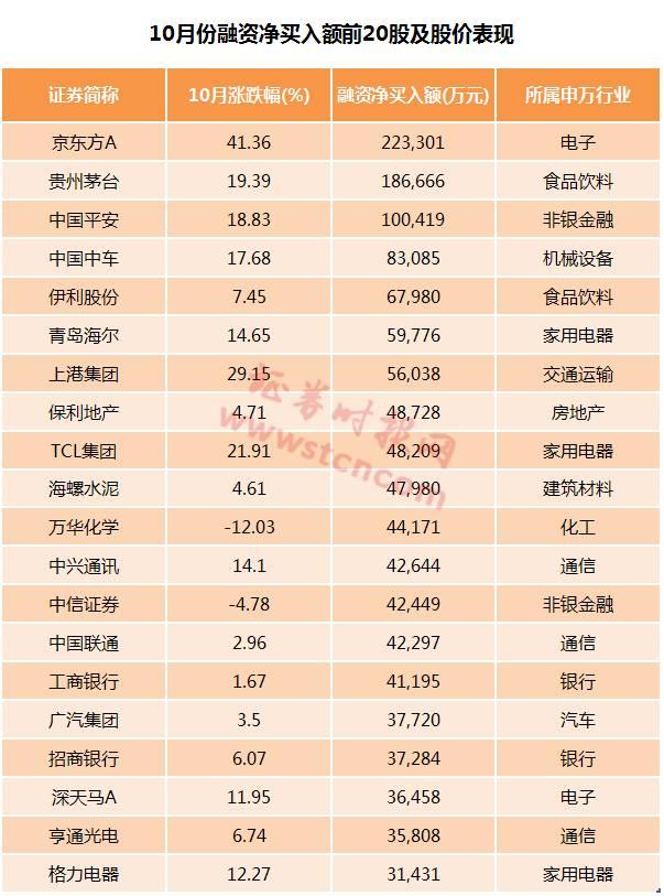 统计数据显示,10月份融资客买入最多的股票是京东方A,融资净买入额达22.33亿元。当月京东方A股价出现暴涨,月度涨幅达41.36%。京东方A能获得融资客的青睐或与其靓丽的业绩表现有关:公司前三季度实现净利润64.76亿元,同比暴增45倍。
