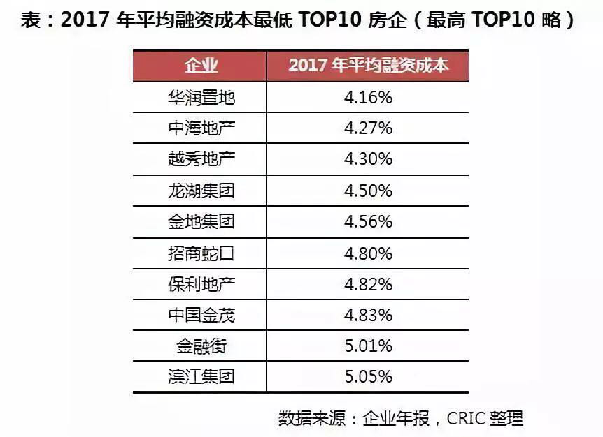 借此,2017年龙湖的平均借贷成本进一步降低至年利率4.5%,平均贷款年限5.92年,达到历史最优水平。在2017年平均融资成本最低的民营房企中,龙湖位居第一。