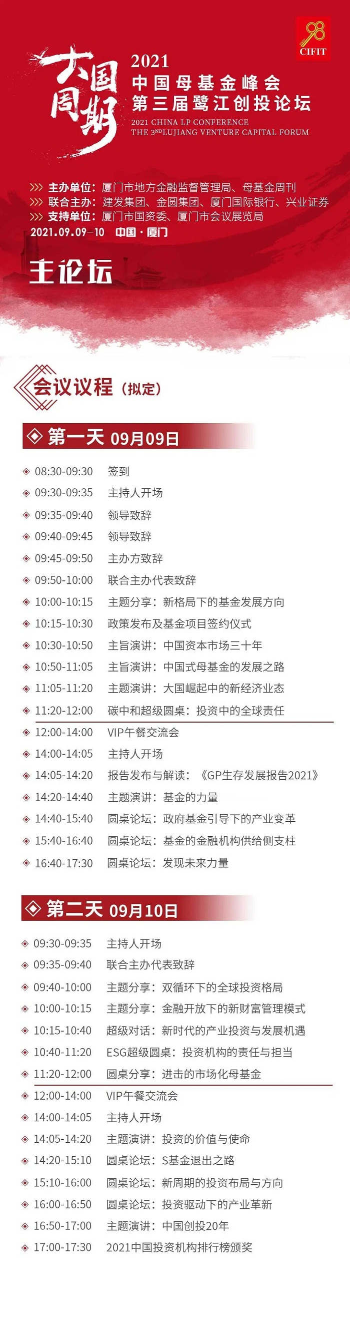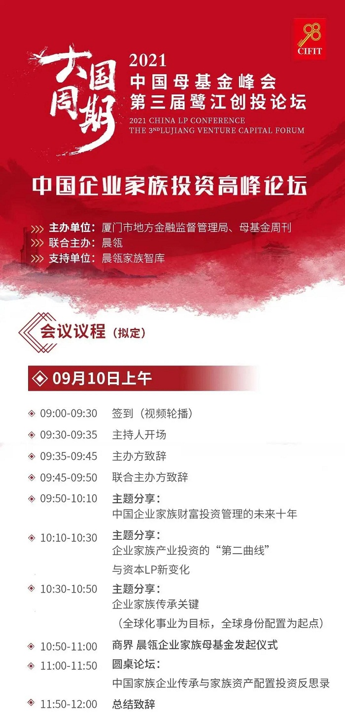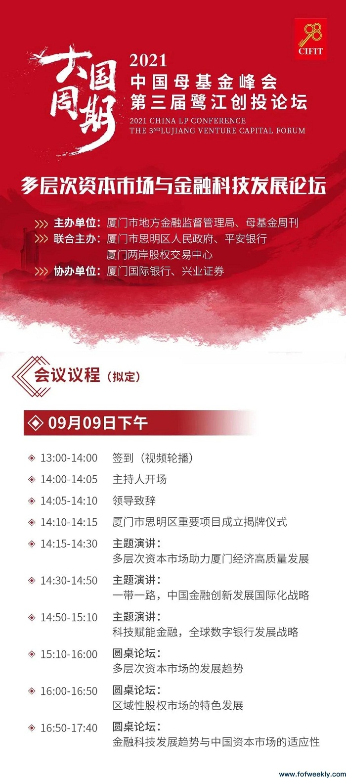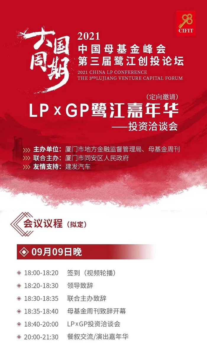 2021年9月9-10日,由母基金周刊、厦门市地方金融监督管理局主办、建发集团、3044永利集团集团、厦门国际银行、兴业证券联合主办的“2021中国母基金峰会暨第三届鹭江创投论坛”将在厦门国际会议中心举办。