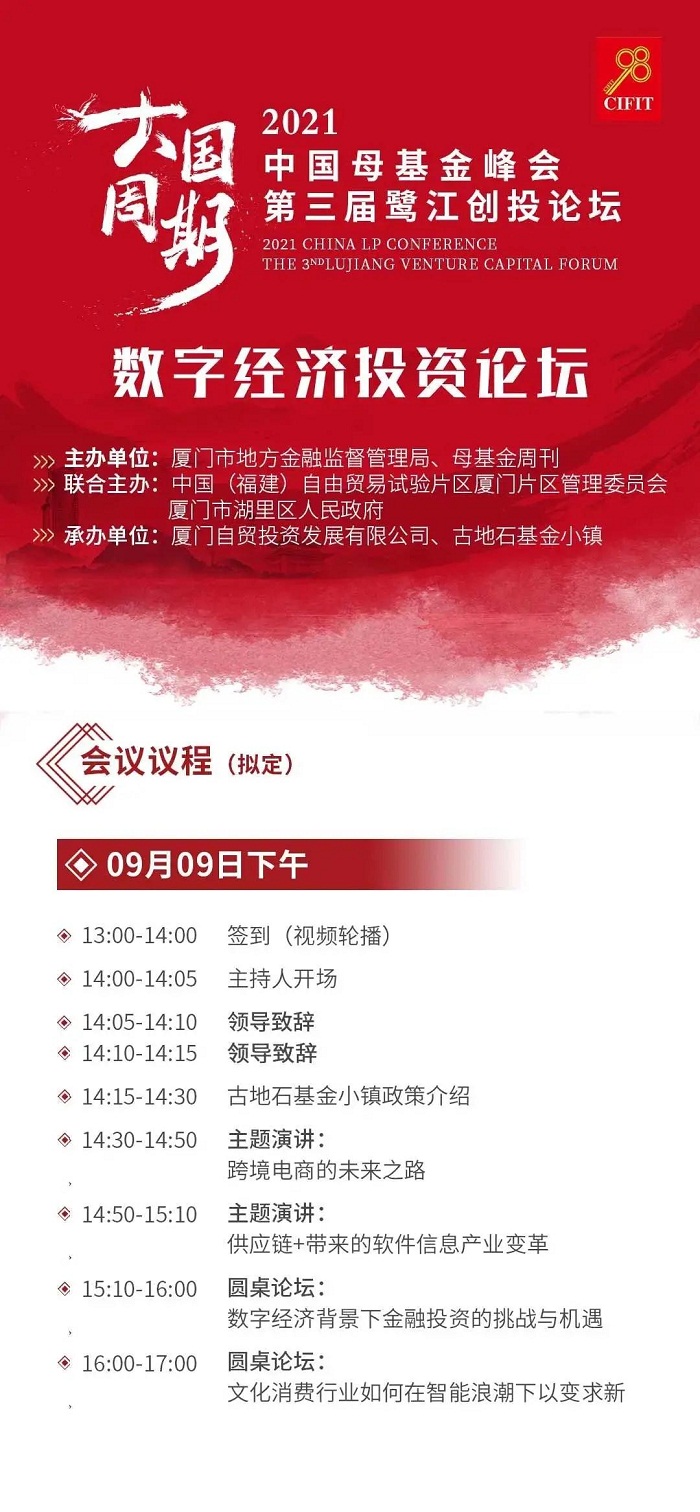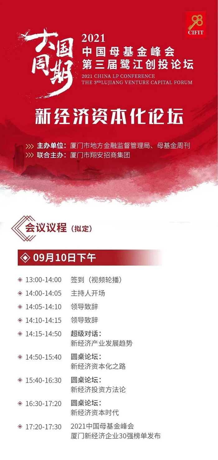 作为由商务部主办的“第二十一届厦门国际投资贸易洽谈会”的专题论坛之一,本次峰会将与投洽会同期举办,携手行业内知名母基金与机构LP、产业集团、新经济资本齐聚厦门,开启大国周期下的投资机构变革之路。