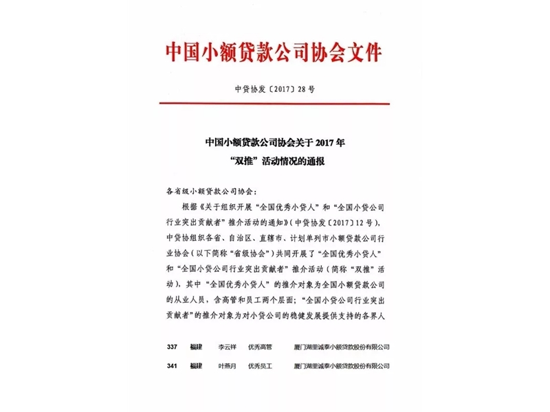 近日,中国小额贷款公司协会正式发文通报了“全国优秀小贷人”和“全国小贷...