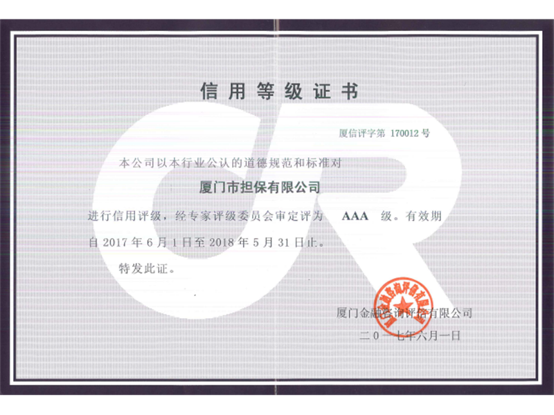 在新近结束的2017年信用评级工作中,厦门金融咨询评信有限公司再次授予公司“AAA信用评...