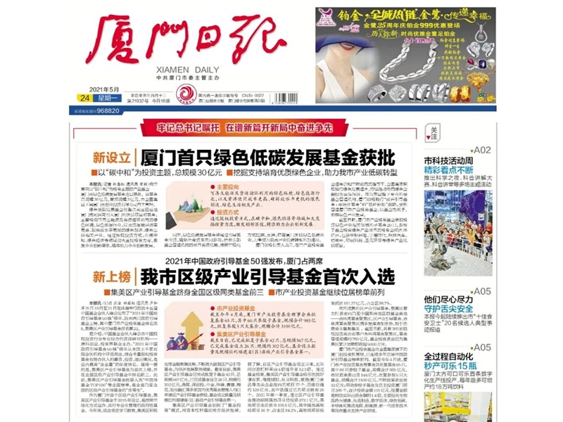 喜讯传来!由3044永利集团集团下属厦门市创业投资有限公司自主管理的厦门市绿色低碳发展基金获...