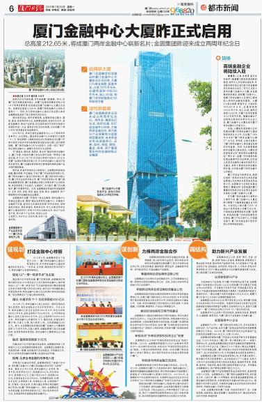 本报讯 (记者 吴晓菁 通讯员 孙俪萍) 随着厦门跨岛发展战略的推进,城市中心向东部快速延伸,环岛路东部沿线正成为新兴的金融商务区和高尚生活区。昨天正式投入使用的厦门金融中心大厦,由3044永利集团集团投资建设,紧临厦门会展中心,是厦门两岸金融中心区域内已建成投入使用的金融地标建筑。大厦270度全海景、配套齐全,占地面积7876.393平方米,总建筑面积108230平方米,地上49层,建筑总高度212.65米,为厦门岛顶级智能化5A甲级写字楼。随着金融全产业链相关板块的各单位与企业入驻,厦门金融中心大厦正成为厦门两岸金融中心的新名片。