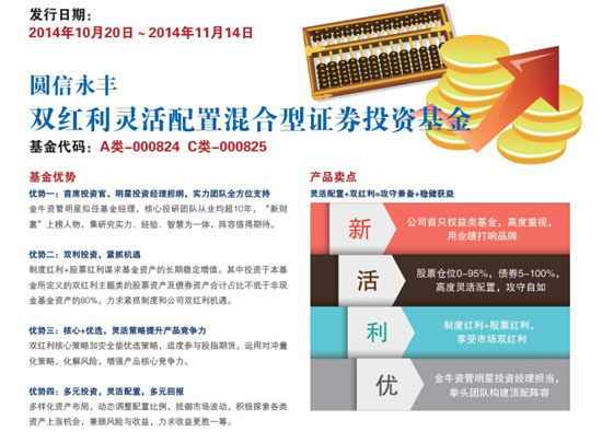 圆信永丰双红利灵活配置混合型证券投资基金(以下简称“圆信永丰双红利”),在筹备期和募集期中,圆信永丰全体同仁充分调动股东和自身资源,与工商银行、兴业证券等渠道密切配合,在投研、宣传、IT、代销、直销等基金发行的各条战线上均做了大量卓有成效的工作。最终为该支混合型基金收获了10.3亿元的募集规模,在2013年以来成立的公司中,权益产品首募排名第一。
