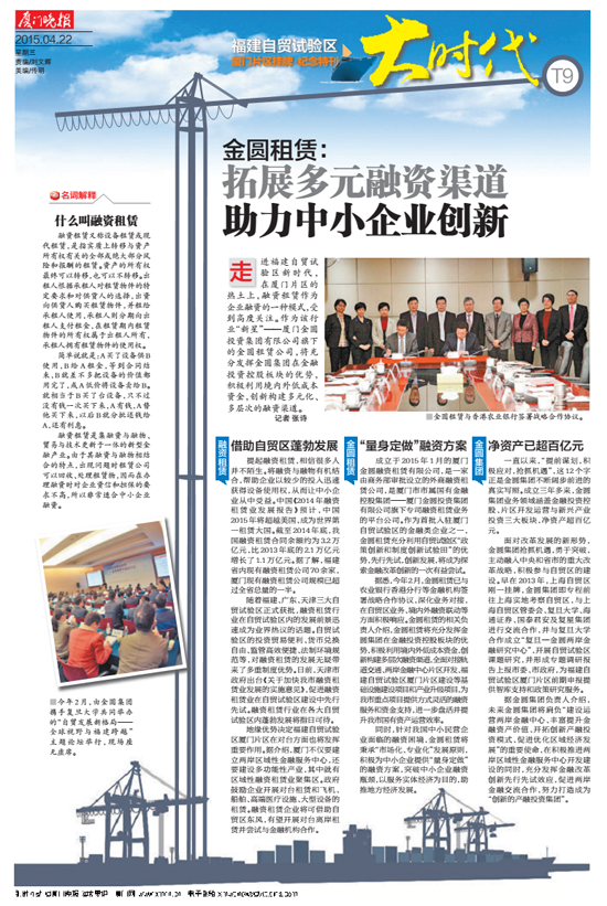 提起融资租赁,相信很多人并不陌生。将融资与融物有机结合,帮助企业以较少的投入迅速获得设备使用权,从而让中小企业从中受益。中国《2014年融资租赁业发展报告》预计,中国2015年将超越美国,成为世界第一租赁大国。截至2014年底,我国融资租赁合同余额约为3.2万亿元,比2013年底的2.1万亿元增长了1.1万亿元。据了解,福建省内现有融资租赁公司70余家,厦门现有融资租赁公司规模已超过全省总量的一半。