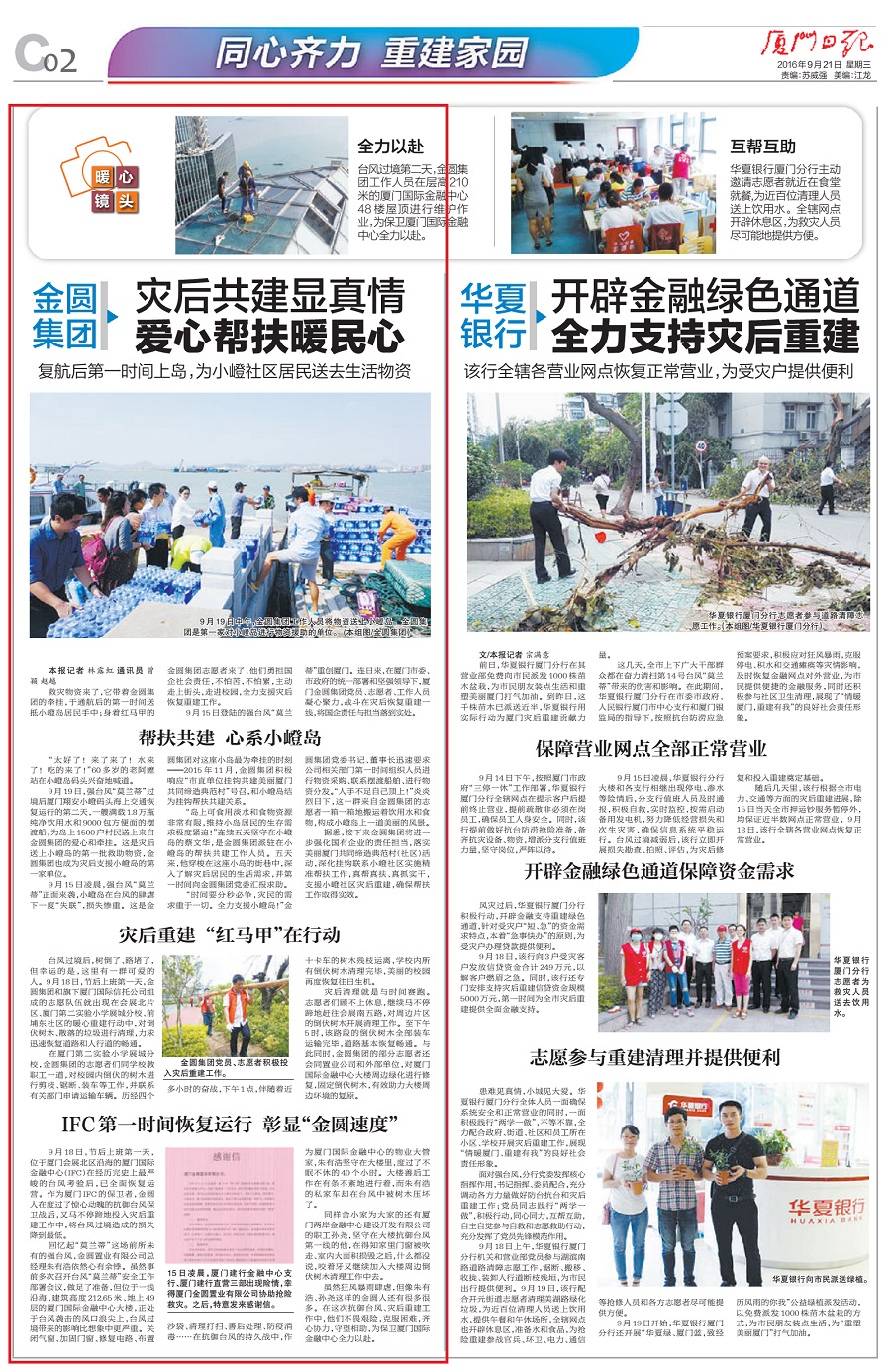 9月15日登陆的强台风“莫兰蒂”重创厦门。连日来,在厦门市委、市政府的统一部署和坚强领导下,厦门3044永利集团集团党员、志愿者、工作人员凝心聚力,战斗在灾后恢复重建一线,将国企责任与担当落到实处。