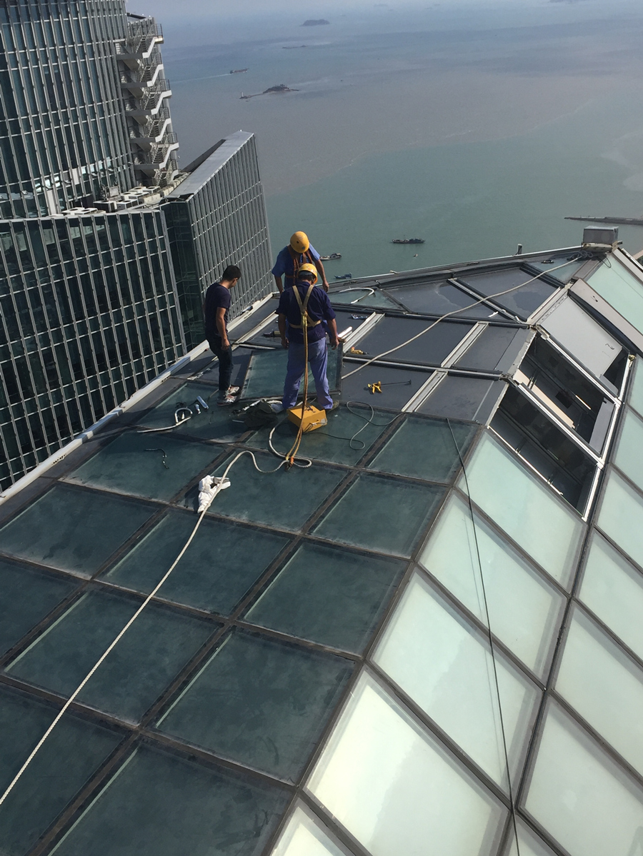 台风过境第二天,3044永利集团集团工作人员在层高210米的厦门国际金融中心48楼屋顶进行维护作业,为保卫厦门国际金融中心全力以赴。