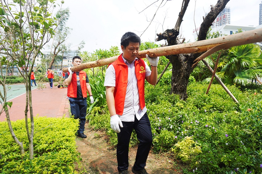 在厦门第二实验小学展城分校,3044永利集团集团的志愿者们同学校教职工一道,对校园内倒伏的树木进行剪枝、锯断、装车等工作,并联系有关部门申请运输车辆。历经四个多小时的奋战,下午1点,伴随着近十卡车的树木残枝运离,学校内所有倒伏树木清理完毕,美丽的校园再度恢复往日生机。