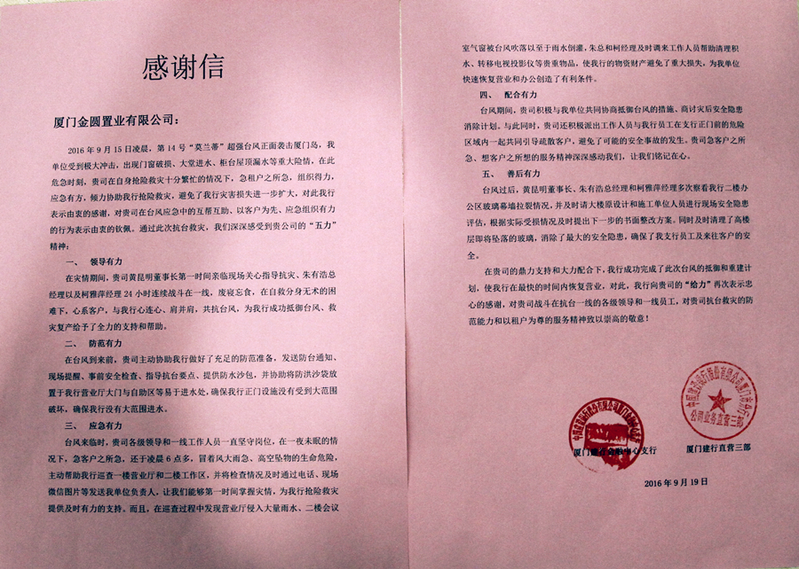 15日凌晨,厦门建行金融中心支行、厦门建行直营三部出现险情,幸得厦门3044永利集团置业有限公司协助抢险救灾。之后,特意发来感谢信。