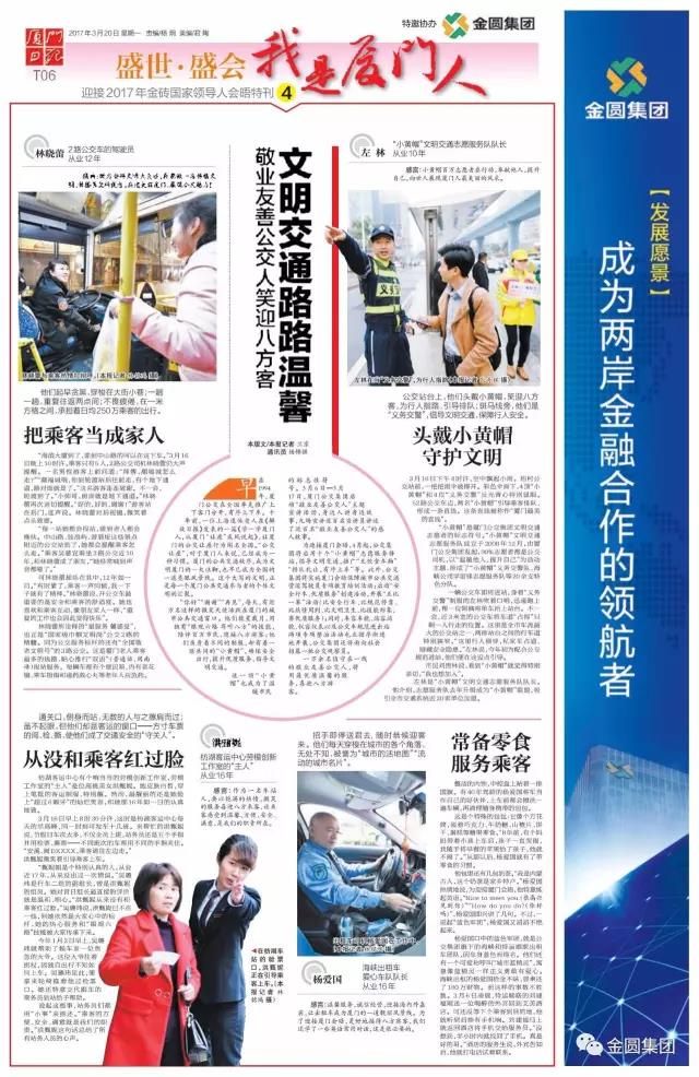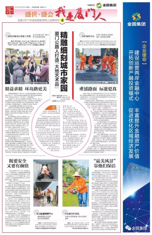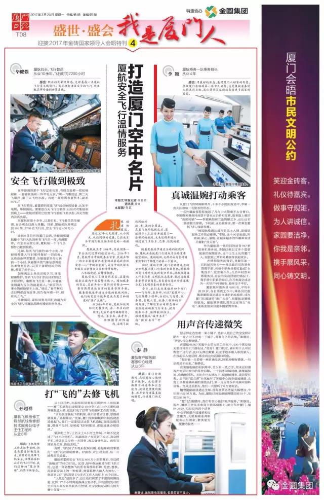 3月20日,《厦门日报》T01-T08版再度推出《盛世·盛会》第四期特刊——《奉献之花绽放鹭岛春天里》,向世界展现厦门人文明有礼、开放热情的风度,敬业奋斗、拼搏创新的风貌。