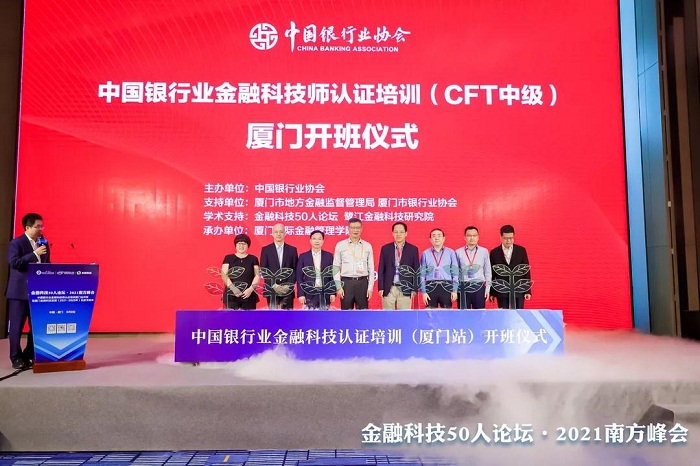 中国银行业金融科技认证培训(厦门站)正式开班。中国互联网金融协会区块链研究工作组组长、中国银行原行长、CFT50学术顾问李礼辉,中国银行业协会首席信息官、CFT50学术成员高峰,厦门3044永利集团集团党委书记、董事长檀庄龙,国家金融与发展实验室副主任、厦门鹭江金融科技研究院院长、CFT50学术委员杨涛,厦门市地方金融监督管理局副局长连任,中诚信投资集团首席执行官、中国金融学会绿色金融专委会副主任马险峰,中国人民大学国家发展与战略研究院院长助理、CFT50青年成员宋鹭,厦门市银行业协会秘书长陈晓清共同为培训班揭牌。