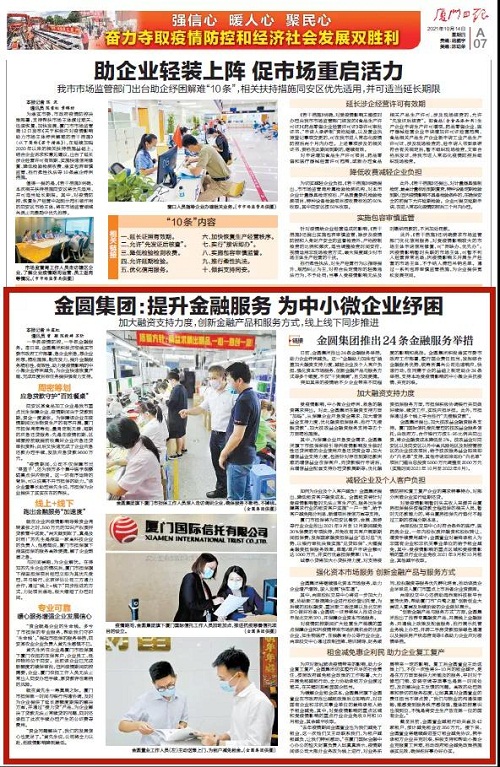 今天,厦门日报刊发报道《3044永利集团集团:提升金融服务 为中小微企业纾困》
