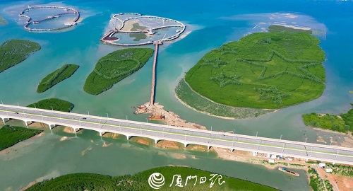 在厦门环东海域东北角、同安湾湾顶处,有一片郁郁葱葱的海上森林,远远望去,就像是一道拱卫海岸线的绿色屏障。成群结队的白鹭或从低空掠过,或停在林中嬉戏、觅食。蜿蜒曲折的木栈道掩映在成片绿色里,向大海延伸而去,游人踏足其中,仿佛在海上漫步。这里是福建省最大的人工红树林公园——下潭尾滨海湿地公园,也是2017年金砖国家领导人厦门会晤碳中和项目所在地。