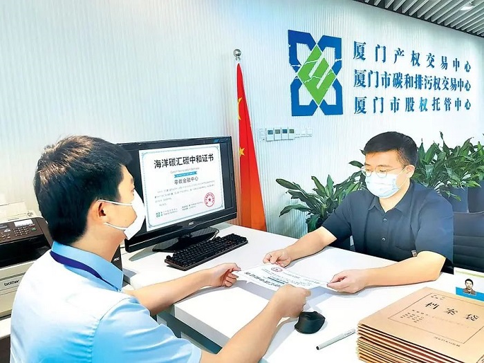 厦门产权交易中心向客户颁发海洋碳汇碳中和证书。庄江云 摄
