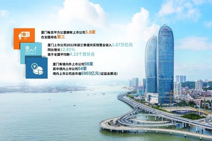 扎根厦门,深耕厦门,借助资本力量做大做强。作为实体经济发展的引领者,厦门上市公司持续发挥“头雁”作用,2022年前三季度共实现营业收入1.67万亿元,同比增长12.81%,高于全国平均数4.23个百分点。一批优秀企业乘着资本市场的东风一路发展壮大。