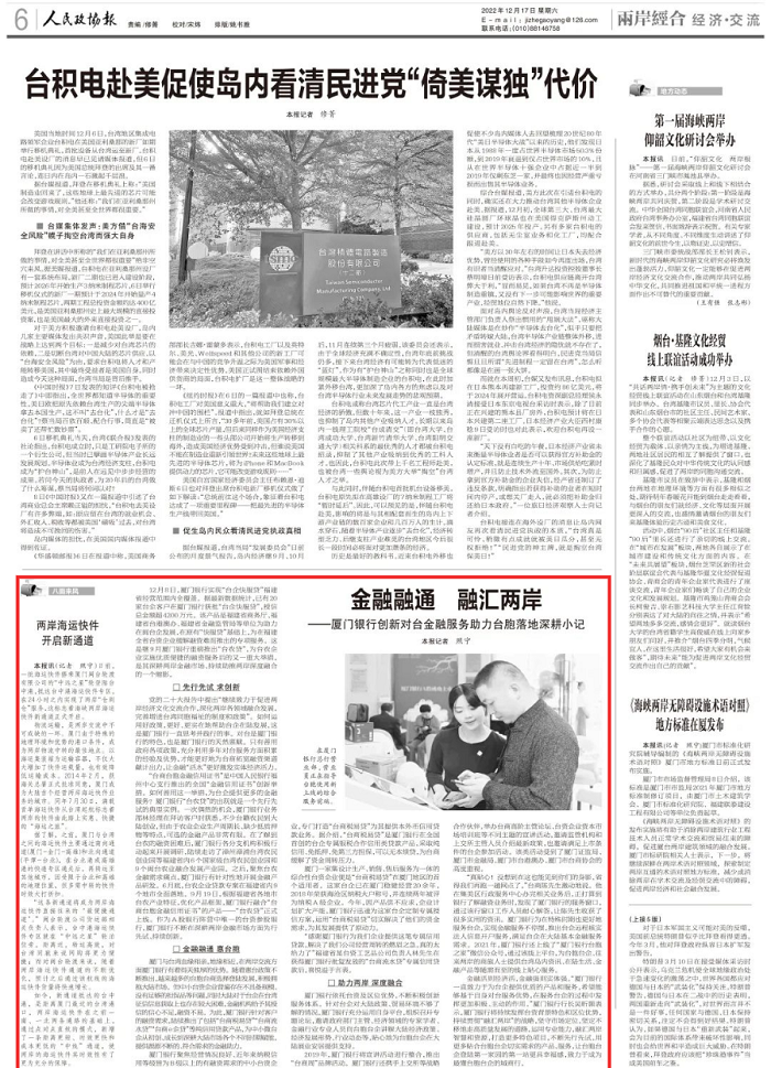 党的二十大报告中提出“继续致力于促进两岸经济文化交流合作,深化两岸各领域融合发展,完善增进台湾同胞福祉的制度和政策”。如何运用好政策,更好、更实在地帮助台企在陆发展,这是厦门银行一直思考并践行的事。对台是厦门银行的特色,也是厦门银行的天然禀赋。只有善用政府各项政策,充分利用多年对台服务方面积累的经验及优势,才能更好地为台商拓宽融资渠道献计出力,让金融“活水”更好激发实体经济活力。