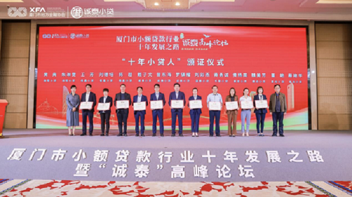 本场论坛邀请了多位业内人士及专家学者开展讲座。其中,厦门恒兴集团董事、副总裁柯希杰以企业家的视角分享对行业发展的思考与见解,并对未来厦门小贷行业的发展充满信心;厦门诚泰小额贷款股份有限公司董事长郑海波带来“厦门小贷服务地方经济发展”的主旨演讲,就诚泰小贷的发展及小贷行业的现状进行分析,并提出以“不变应万变”的方法应对市场变化,实行差异化经营,并借助科技手段提高服务能力,服务好地方经济发展。现场随后还举行了公益捐赠仪式,在厦门诚泰小额贷款股份有限公司等推动下,厦门小贷行业共捐赠10万元,助力闽宁协作开展。现场还为“十年小贷人”颁证,历经十年淬炼,他们是普惠金融的践行者,为小额贷款行业发展之路坚守初心、奋勇前行。