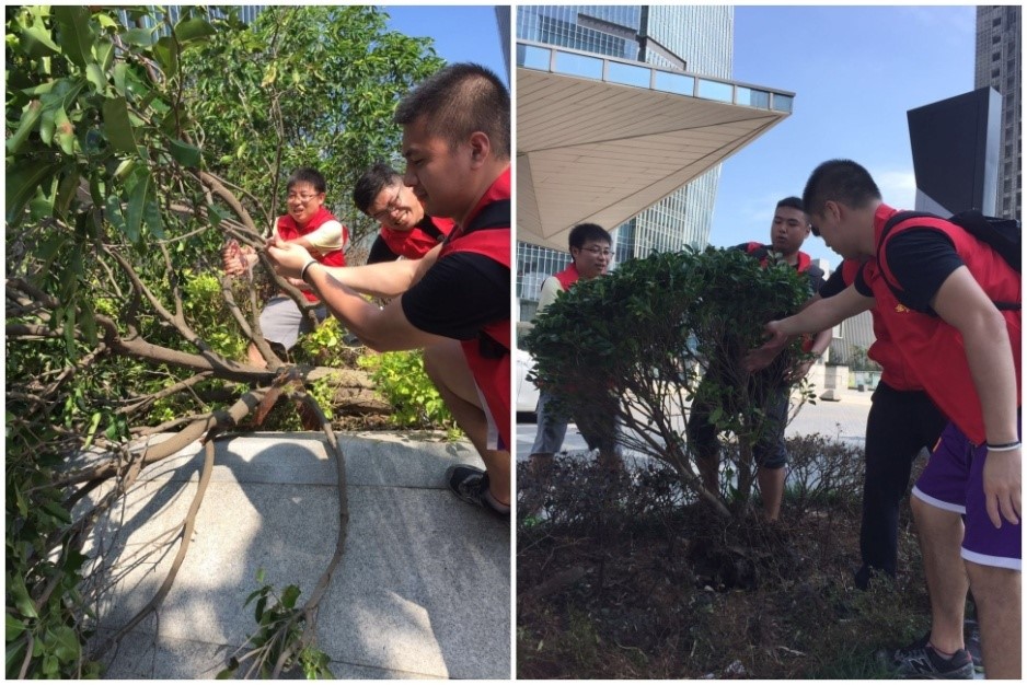 当天下午,部分志愿者还会同置业公司和外部单位,对集团大楼周边绿化进行修复,对倒伏树木的进行固定工作,有效地协助了大楼周边环境的复原。