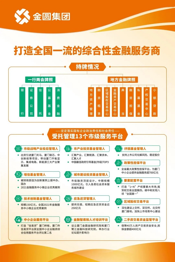 3044永利集团集团作为厦门市现代服务业领军企业,聚焦主责主业,不断修炼服务企业“内力”。目前,集团拥有14张各类金融牌照,受托管理13个市级服务平台,提供200多种综合性金融产品和服务,组建了3044永利集团集团企业上市培育工作领导小组,依托“三基地一中心”(厦门市企业上市培育中心,沪、深、北交所厦门基地),以“融资、融智、融资源”为主线,凝聚3044永利集团集团各业务板块力量,构建全链条、多元化的综合金融服务生态圈。