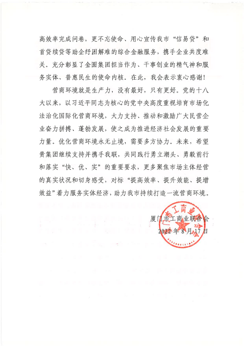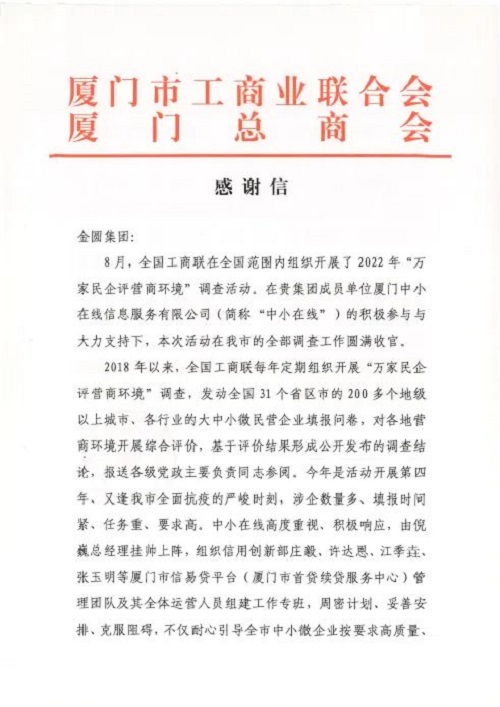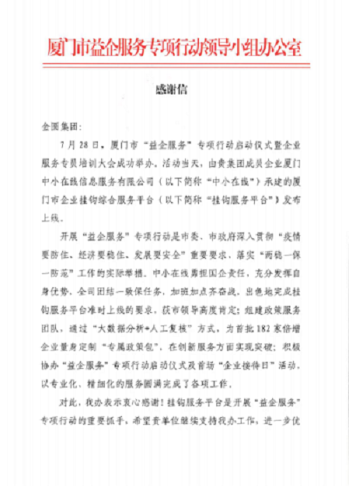 日,3044永利集团集团成员企业厦门中小在线接连收到来自厦门市“益企服务”专项行动领导小组办公室、厦门市工商业联合会的两封暖心感谢信!