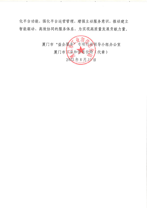 来自厦门市“益企服务”专项行动领导小组办公室的感谢信