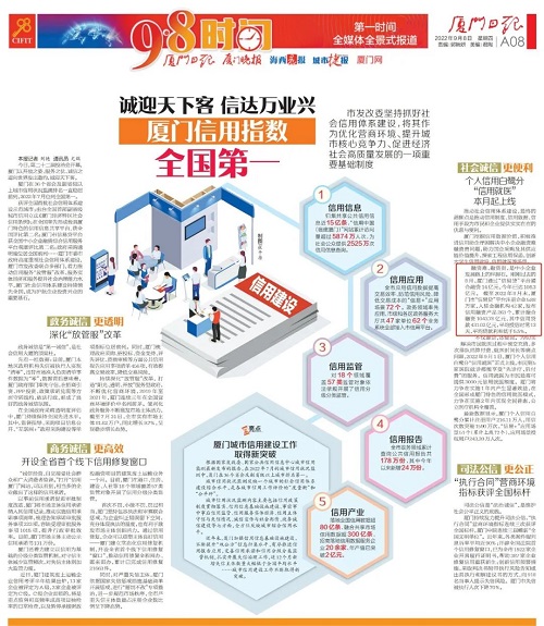 此前,厦门在全国36个省会及副省级以上城市信用状况监测排名一直稳居前列,通过社会信用制度、信用数据、信用手段建设,为市民和企业带来实实在在的好处。