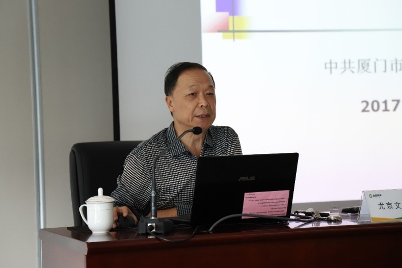 尤教授以《砥砺奋进新时代 促进厦门新发展》为题,结合厦门建设“五大发展”示范市的发展目标,从新时代、新目标、新要求,从新动能、新产业、新发展,从青年兴、国家兴、民族兴三个方面,为全体党员解读了十九大报告精神的相关方面的内容,并鼓励青年党员们要发挥共产党员应起的作用,带动群众,不懈奋斗。